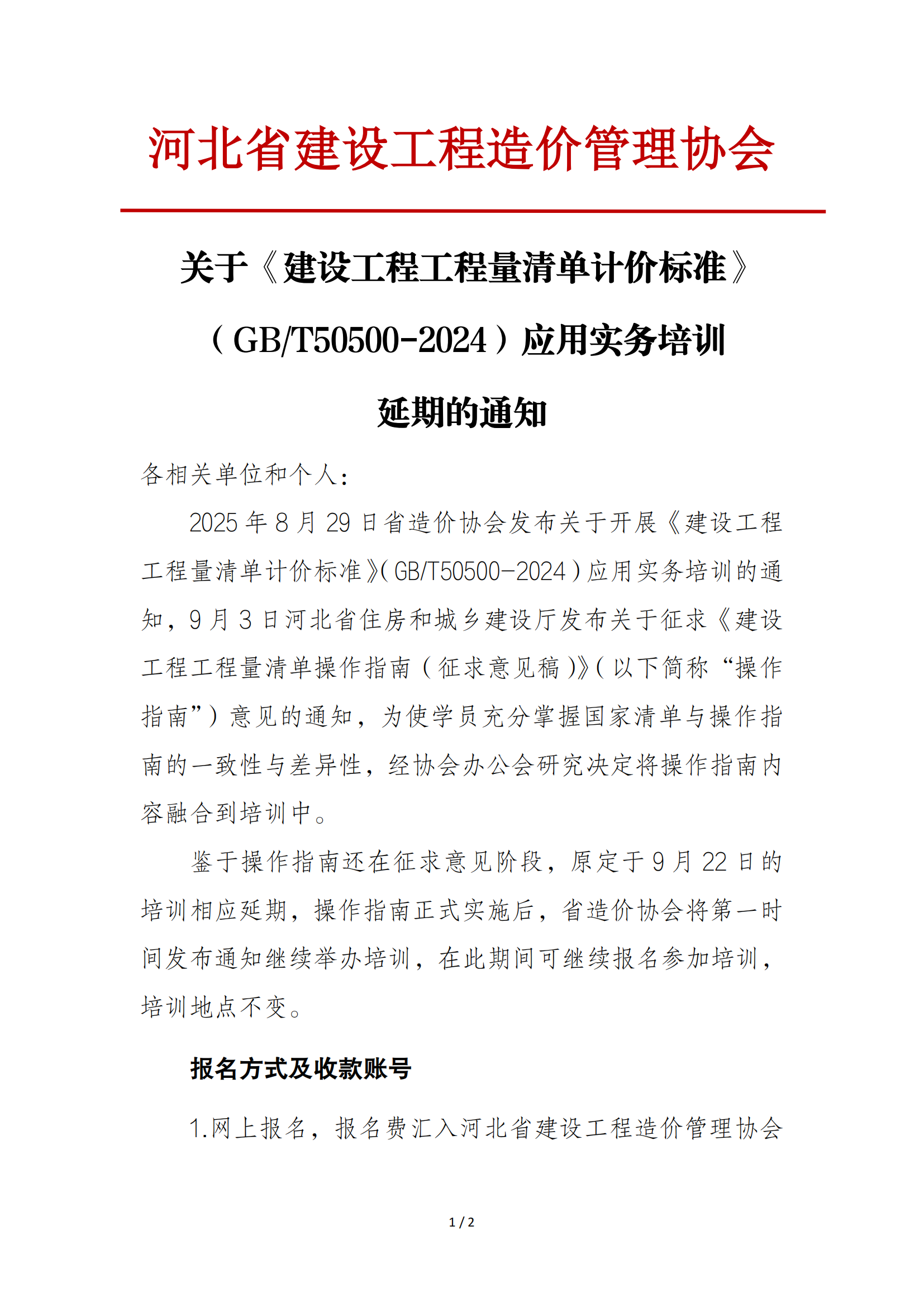 关于《建设工程工程量清单计价标准》(GB/T50500-2024)应用实务培训延期的通知